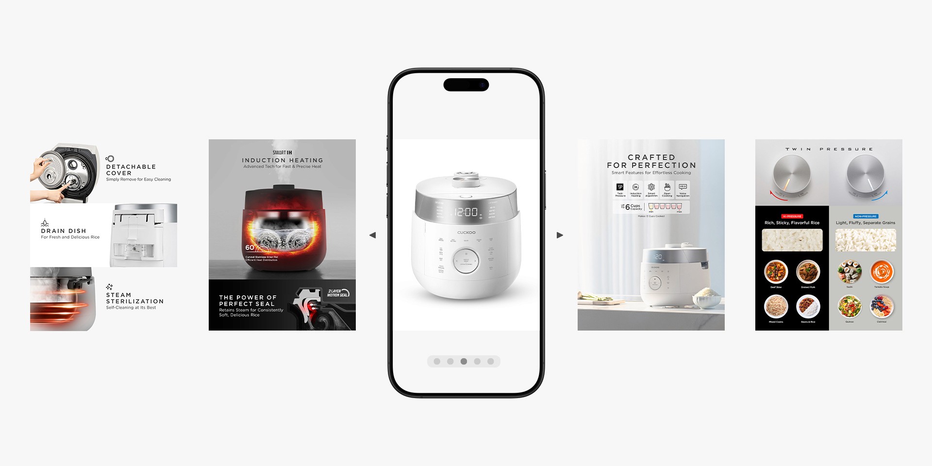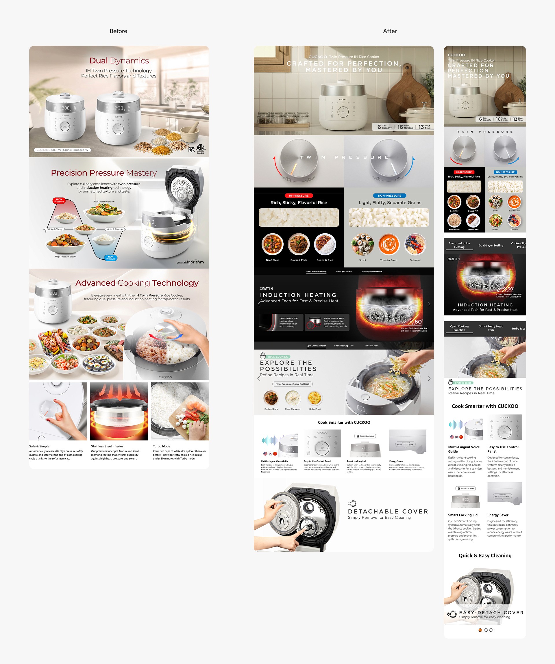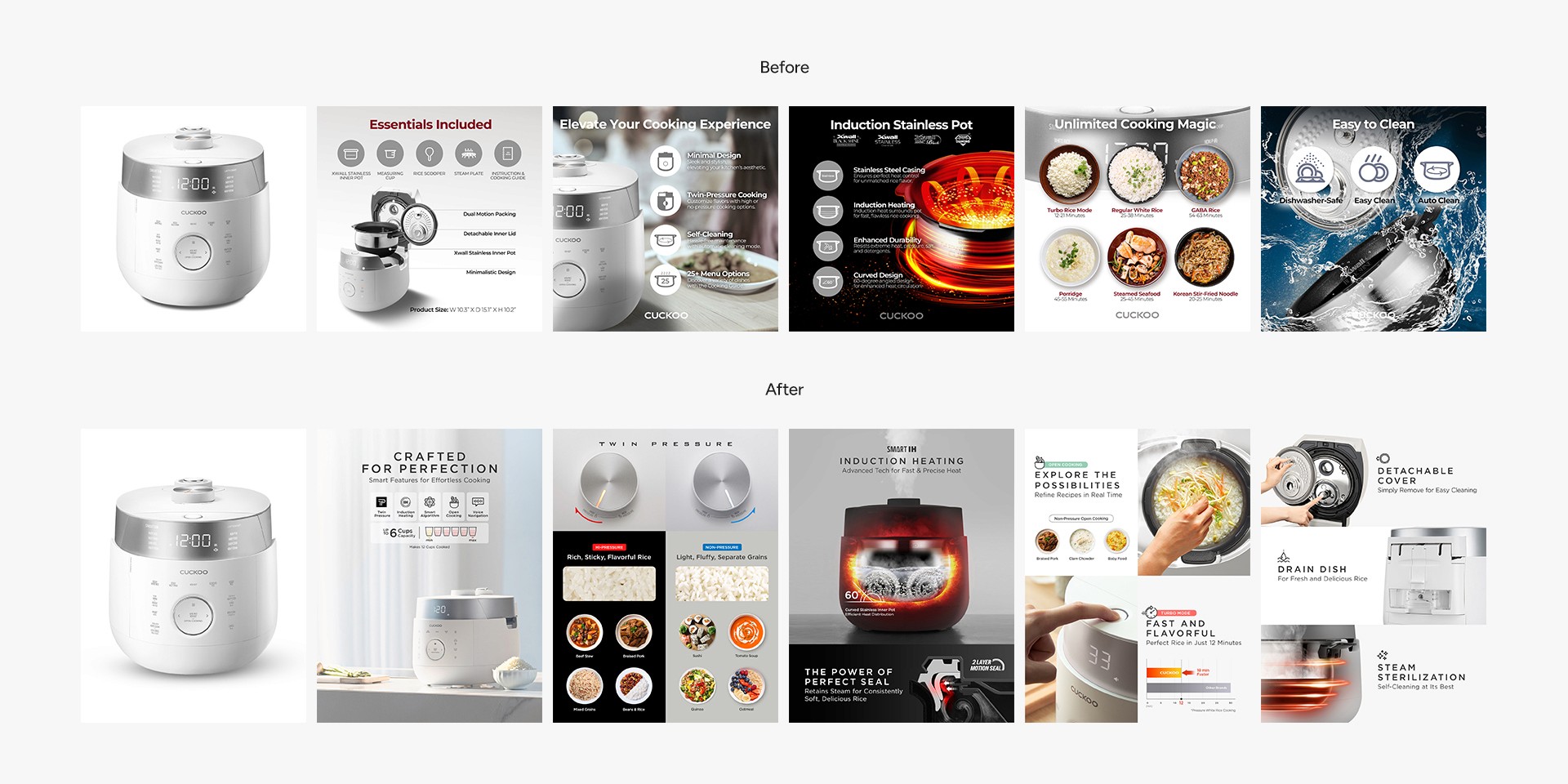 Cuckoo’s Amazon A+ content and product detail pages required a refresh to better communicate product value and strengthen brand perception. The goal was to improve clarity, conversion, and consistency across all listings while maintaining a cohesive premium look.